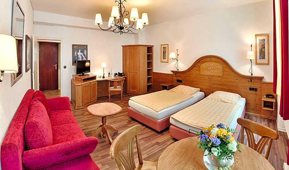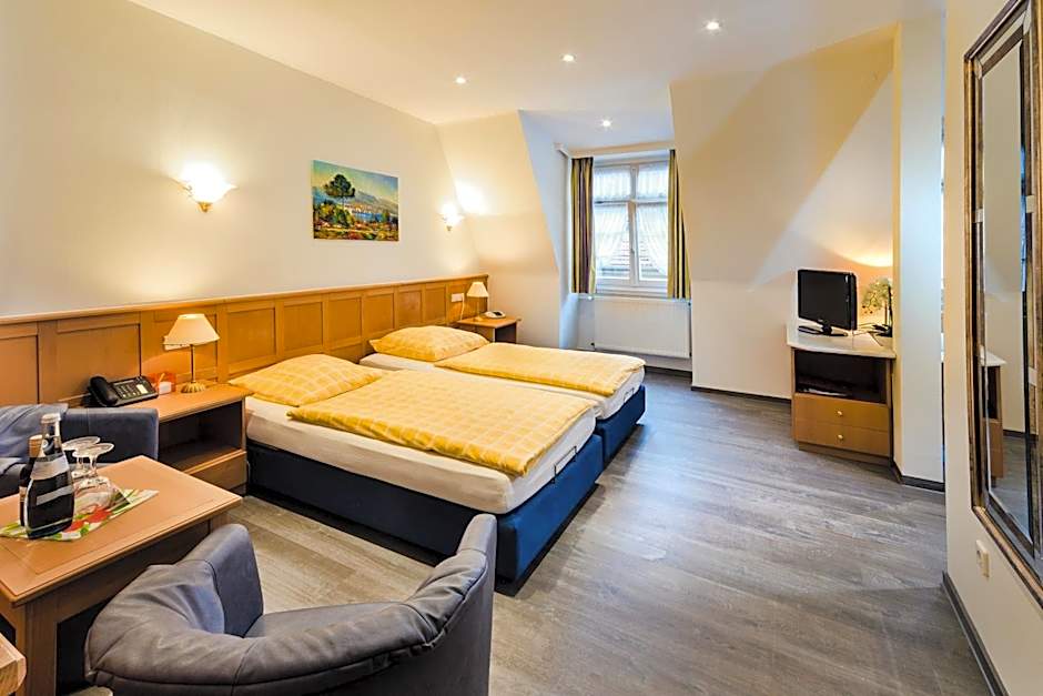 Furnished in a traditional German style, this room features a bathroom with shower. It lies on the 1st floor and offers a view of the city or courtyard.